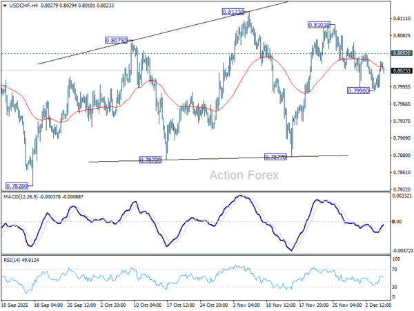 USD/CHF retreated to 0.7990 last week but recovered since then. Initial bias stays neutral this week first. Overall outlook is unchanged that price actions from 0.7828 are developing into a corrective pattern. On the upside, break of 0.8052 will bring stronger rise to 0.8101, and then 0.8123 resistance. On the downside, though, break of 0.7990 will extend the fall from 0.8101 towards 0.7877 support instead.