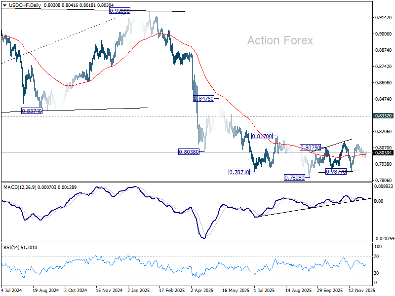 USD/CHF retreated to 0.7990 last week but recovered since then. Initial bias stays neutral this week first. Overall outlook is unchanged that price actions from 0.7828 are developing into a corrective pattern. On the upside, break of 0.8052 will bring stronger rise to 0.8101, and then 0.8123 resistance. On the downside, though, break of 0.7990 will extend the fall from 0.8101 towards 0.7877 support instead.