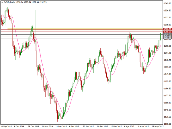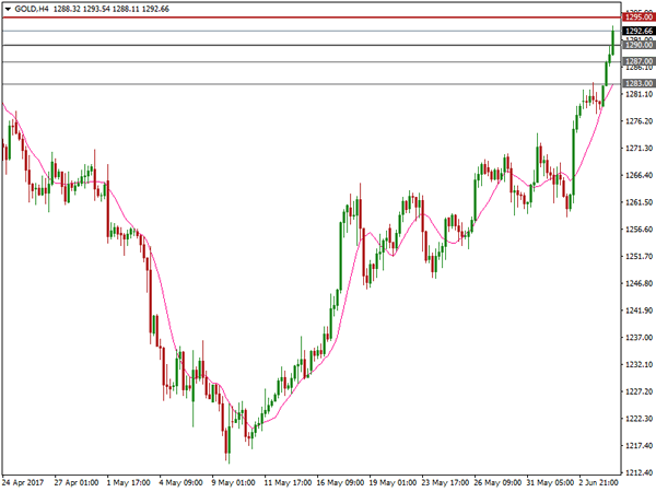 Spot gold has seen a significant 6% gain since May 11th. On Tuesday, June 6th, spot gold rallied 1.1%, hitting a high of $1293.54, last seen on April 17.