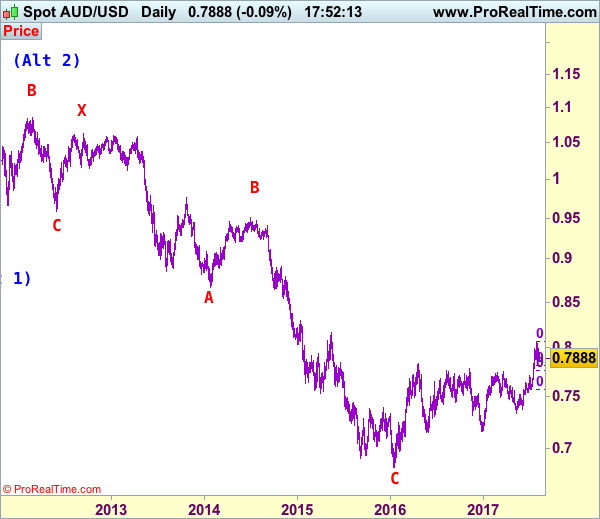 We are keeping our count that top has been formed at 1.1081 (wave 5 of V) and major correction (A-B-C-X-A-B-C) has commenced, indicated downside targets at 0.7945 (61.8% Fibonacci retracement of entire rise from 0.6007-1.1081) and 0.7750 had been met and downside bias is seen for further weakness to 0.6800, then 0.6700 but reckon 0.6500 would hold from here.
