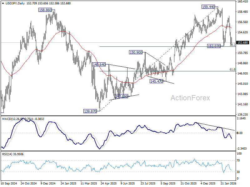 USD/JPY fell sharply last week but the decline lost momentum ahead of 152.07 support. Intial bias stays neutral this week first. With 38.2% retracement of 139.87 to 159.44 at 151.96 intact, price actions from 159.44 are seen as a consolidations pattern only. On the upside, sustained break of 55 4H EMA (now at 154.51) will bring stronger rebound towards 157.65. However, decisive break of 151.96 will argue that it's reversing the rise from 139.87 already. In this case, deeper fall should then be seen to 61.8% retracement at 147.34, and possibly below.