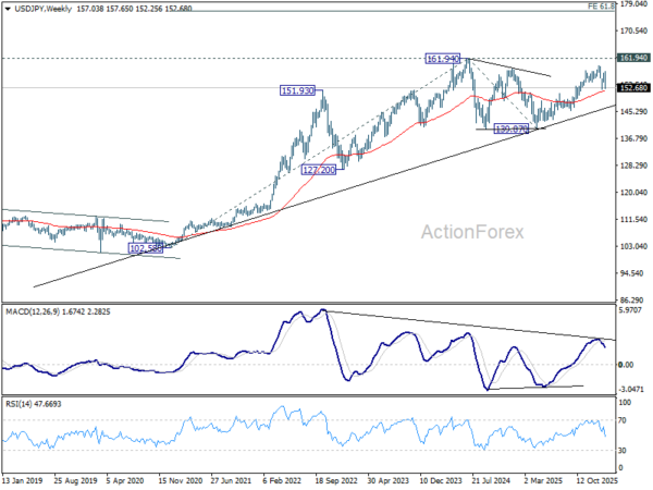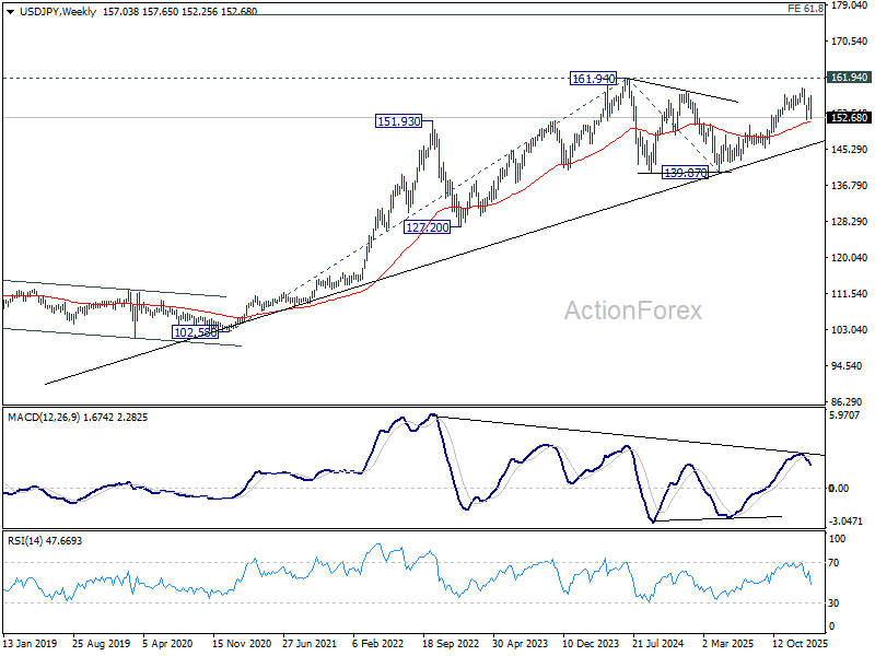 In the bigger picture, outlook is unchanged that corrective pattern from 161.94 (2024 high) should have completed with three waves at 139.87. Larger up trend from 102.58 (2021 low) could be ready to resume through 161.94. This will remain the favored case as long as 55 W EMA (now at 151.68) holds. However, sustained break of 55 W EMA will argue that the pattern from 161.94 is extending with another falling leg.