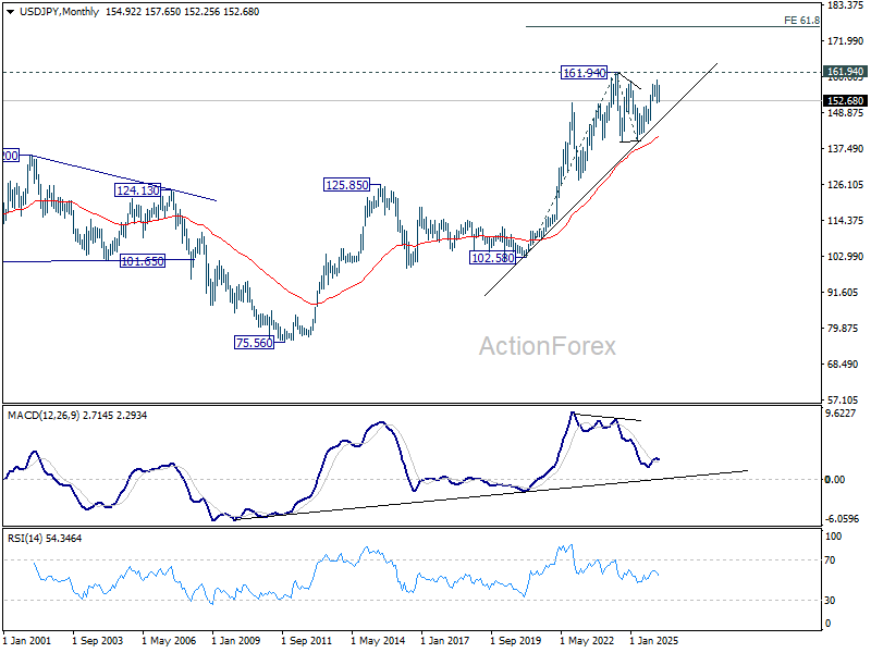 In the long term picture, up trend from 75.56 (2011 low) is still in progress and might be ready to resumption. Firm break of 161.94 will target 61.8% projection of 102.58 (2020 low) to 161.94 (2024 high) from 139.87 at 176.55 in the medium term. Long term outlook will stay bullish as long as 139.87 support holds, even in case of deep pullback.
