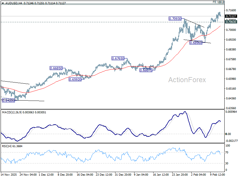 AUD/USD's up trend resumed by breaking through 0.7093 resistance. Intraday bias is now on the upside for 100% projection of 0.5913 to 0.6706 from 0.6420 at 0.7213. On the downside, below 0.7063 minor support will turn intraday bias neutral again. But retreat should be contained above 0.6896 support to bring another rally.