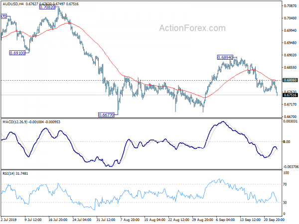 In the bigger picture, decline from 0.8135 (2018 high) is seen as resuming the long term down trend from 1.1079 (2011 high). Next target is 0.6008 (2008 low). On the upside, break of 0.7082 resistance is needed to be the first sign of medium term bottoming. Otherwise, outlook will remain bearish even in case of strong rebound.