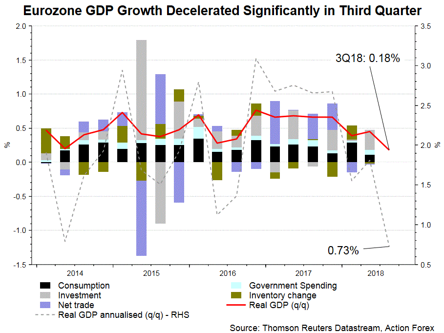ECB has tilted its tone on the economic outlook recently. In the minutes for the October meeting, ECB acknowledged “uncertainties and fragilities” in the economy. The members noted that risks to the economic outlook is skewed to the downside as driven by the uncertainties related to global trade. Yet, it reiterated the incoming data had not been able to derail Eurozone’s strength. In short, the October meeting concluded that “the incoming data, while somewhat weaker than expected, remained overall consistent with an ongoing broad-based expansion”.