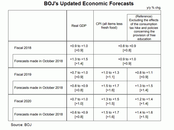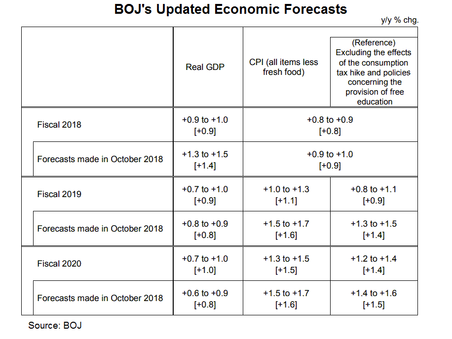 According to BOJ, the downside revision of CPI for fiscal 2019 is “due primarily to the decline in crude oil prices”. On economic growth, the median real GDP is expected to growth by +0.9% fiscal 2019, up from +0.8% projected in October. Growth would climb slightly higher to +1% (Oct: +0.8%) in fiscal 2020.