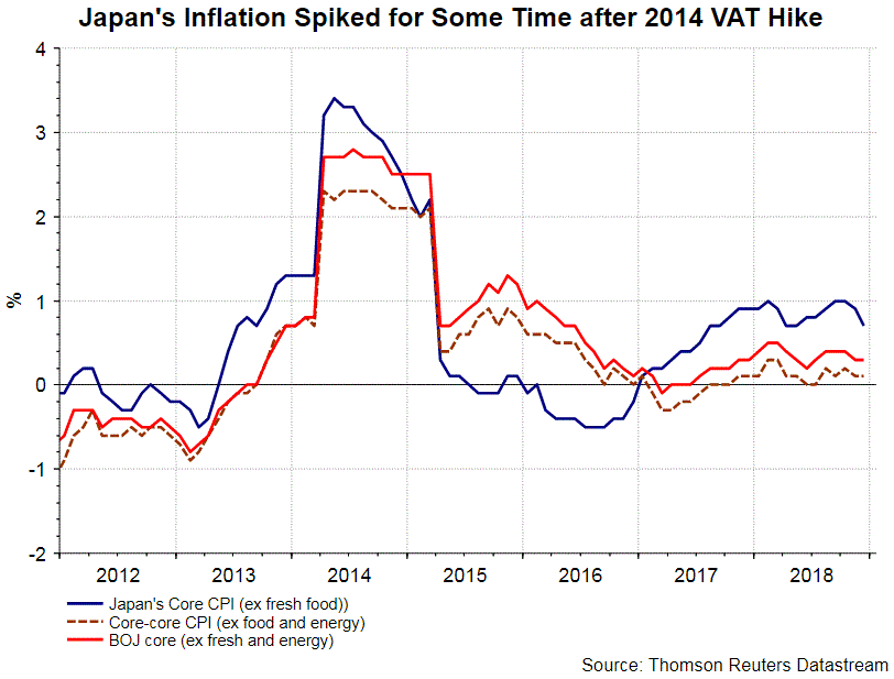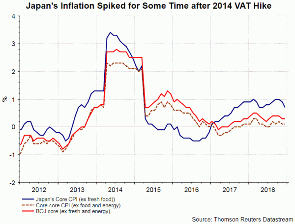 As suggested in the economic statement, BOJ noted that the VAT hike would affect the GDP growth rates in the following ways: 1) the front-loaded increase and subsequent decline in demand prior to and after the consumption tax hike and 2) a decline in real income. It added that “the negative impact on the growth rates is expected to be smaller than that on the rate for fiscal 2014, when the last consumption tax hike took place”. The VAT tax will increase from 8% to 10% in October 2019. In order to reduce the impact of the fiscal tightening, the government has planned to add stimulus worth of about 1.8 trillion yen to the market. The economic projections signal that BOJ expect VAT tax would help growth and stimulate inflation.