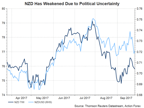 As widely anticipated, RBNZ left the OCR unchanged at 1.75% in September Policymakers downgraded the domestic growth outlook and suggested that the accommodative monetary policy would stay for a ‘considerable period’. Thanks to the recent decline in New Zealand, driven by heightened political uncertainty, RBNZ tweaked its warning over currency strength. It noted that a lower exchange rate would "would help" raise tradables inflation. We expect RBNZ to keep the policy rate unchanged for the rest of the year, and likely through 2018.