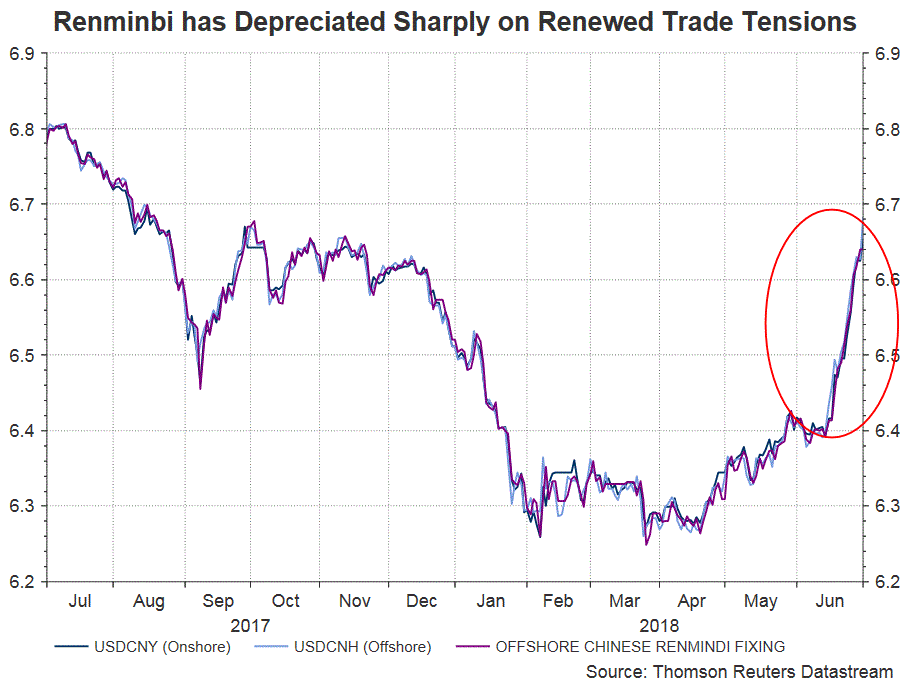 Weakness in renminbi has accelerated recently, driven by Donald Trump’s new list of tariff against China announced in mid-June, PBOC’s RRR cut and the jump in risk aversion over the Chinese market. USDCNY’s rally of more than +4% over the past two weeks has raised speculations about China’s retaliation against the US-induced trade tensions. It has also recalled the massive capital outflow in China after the authority’s currency reform in August 2015. While we agree that China might have intentionally allowed its currency to depreciate of late, excessive currency weakness would exacerbate China’s problem, especially during the current time of growth slowdown, elevated debt levels and stock market crash. The Chinese government is cautiously monitoring the situation so that renminbi depreciation would not trigger the capital flight like the one happened three years ago.