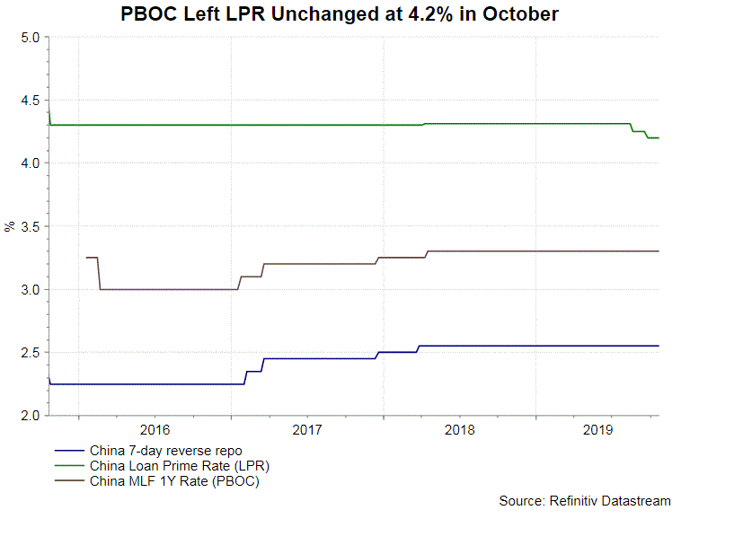 Recall that on August 17, PBOC announced that it would set the LPR according to the medium lending facility (MLF) rate. From August onwards, PBOC will fix the LPR on the 20th of each month, using quotations submitted by 18 banks. The central bank embarked the new mechanism by cutting the one- year LPR by -6 bps to 4.25% in August. This was followed by a -5 bps cut to 4.2% in September. Contrary to market expectations of further reduction, the LPR stayed in unchanged in October. The 5-year LPR has been steadied at 4.85%, since the -5 bps cut in August.