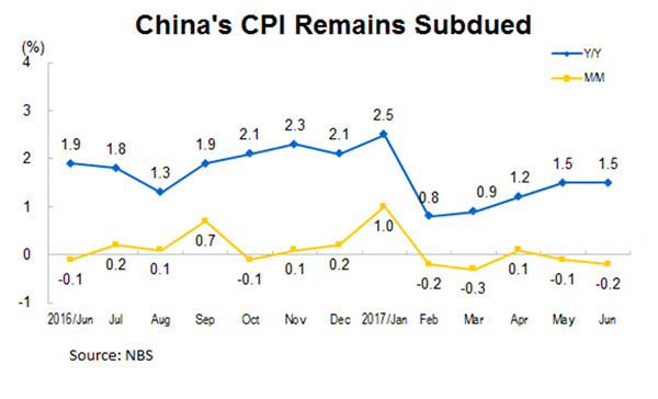 The set of June data released so far has pointed to a steady growth trend in China, the world’s second largest economy. Released earlier in the week, headline CPI stayed unchanged at +1.5% y/y in June, shy of consensus of +1.6%. Persistently soft food price (on deflation) continued to put downward pressure on the headline reading. For instance, pork plummeted -16.7 and egg price fell -9.3%.PPI, upstream price levels, steadied at +5.5% in June, in line with expectations. Subdued inflation offers the government room to maintain its targeted tightening measures, focusing on cracking down overheating asset prices. Yet, soft PPI suggested that growth in industrial profits would be limited.