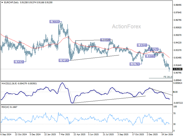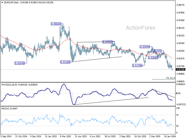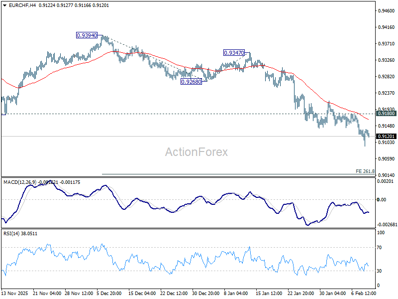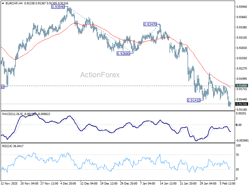 EUR/CHF's down trend resumed by breaking through 0.9141 support and intraday bias is back on the downside. Next target is 261.8% projection of 0.9394 to 0.9268 from 0.9347 at 0.9017. On the upside, however, break of 0.9180 resistance will now indicate short term bottoming, and bring lengthier consolidations.