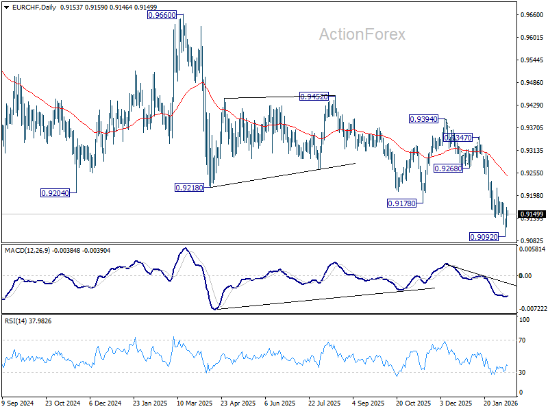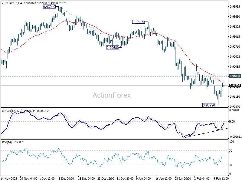 Intraday bias in EUR/CHF is turned neutral first with current recovery. Further decline is expected as long as 0.9180 resistance holds. Below 0.9092 will resume larger down trend to 261.8% projection of 0.9394 to 0.9268 from 0.9347 at 0.9017 next. However, considering bullish convergence condition in 4H MACD, firm break of 0.9180 will indicate short term bottoming, and bring stronger rebound towards 55 D EMA (now at 0.9246).