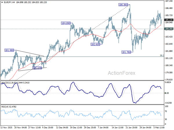 Immediate focus stays on 38.2% retracement of 172.24 to 186.86 at 181.27 in EUR/JPY. Decisive break there will argue that fall from 186.86 is correcting whole up trend from 154.77. Next near term target will be 161.8% projection of 186.86 to 181.76 from 186.22 at 177.96. Nevertheless, strong rebound from current level, followed by break of 182.99 minor resistance will retain near term bullishness, and bring retest of 186.86 high first.