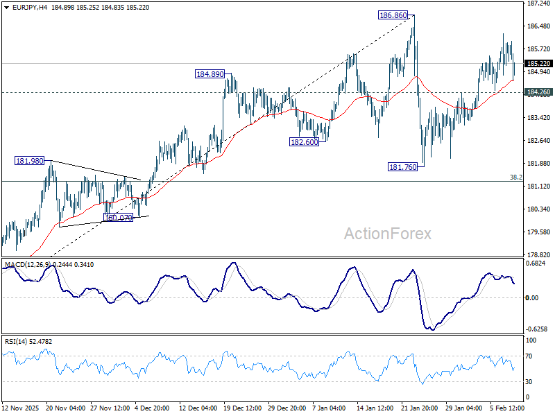 EUR/JPY retreated ahead of 186.86 resistance and intraday bias remains neutral first. On the downside, below 184.26 minor support will extend the corrective pattern from 186.86 with another downleg, towards 181.76. But downside should be contained by 38.2% retracement of 172.24 to 186.86 at 181.27 to bring rebound. On the upside, decisive break of 186.86 will resume larger up trend.