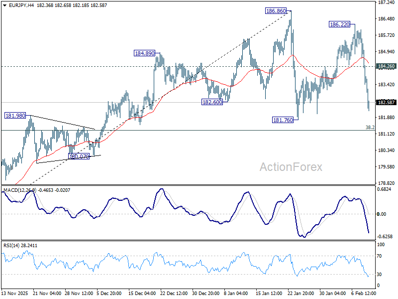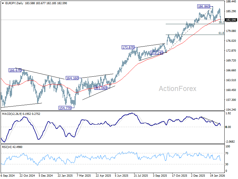 While EUR/JPY's current fall is steep, overall price actions from 186.86 are still seen as a consolidation pattern. Downside should be contained by 38.2% retracement of 172.24 to 186.86 at 181.27 to bring rebound. Break of 186.86 resistance is expected at a later stage to resume the larger up trend. However, sustained break of 181.27 will indicate that larger scale correction is already underway.