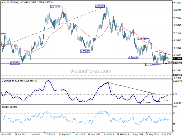 AUD/USD is still bounded in consolidation from 0.7309. Intraday bias remains neutral and more sideway trading could be seen. On the downside, break of 0.7309 and sustained trading below 0.7328 cluster support (61.8% retracement of 0.6826 to 0.8135 at 0.7326) will extend the fall from 0.8135 to 0.7158 support next. On the upside, above 0.7483 resistance will bring stronger rebound. But upside should be limited below 0.7676 resistance to bring larger fall resumption eventually.