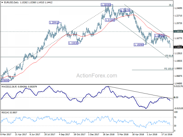 In the bigger picture, the down trend from 1.2555 medium term is in progress for 61.8% retracement of 1.0339 to 1.2555 at 1.1186. Note again that EUR/USD was rejected by 38.2% retracement of 1.6039 (2008 high) to 1.0339 (2017 low) at 1.2516. That carries some long term bearish implications. Sustained break of 1.1186 could pave the way back to retest 1.0339 low. For now, even in case of rebound, we won’t consider the fall from 1.2555 as finished as long as 1.1851 resistance holds.
