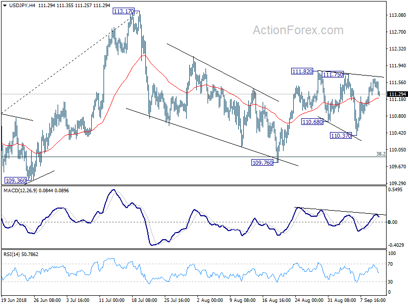 USD/JPY dips mildly after failing to break out 111.75/82 resistance zone. But downside is contained above 4 hour 55 EMA (now at 111.20) so far. Intraday bias remains neutral at this point. And intraday bias stays neutral first. On the upside, break of 111.73 minor resistance will suggest that the rise from 109.76 is resuming. And intraday bias will be turned back to the upside for retesting 113.17 high. Decisive break there will resume larger rally from 104.62. On the downside, below 110.37 will bring deeper fall. But strong support is expected from 38.2% retracement of 104.62 to 113.17 at 109.90 to contain downside and bring rebound.