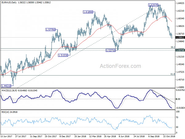 EUR/AUD’s decline resumed after consolidation from 1.5575 entered rather quickly, dropping to as low as 1.5546 so far. Intraday bias is back on the downside. Current fall from 1.6357 should target 1.5271/5313 cluster support zone next. On the upside, though, break of 1.5693 resistance will now indicate short term bottoming. In that case, lengthier consolidation would be seen first before staging another decline.