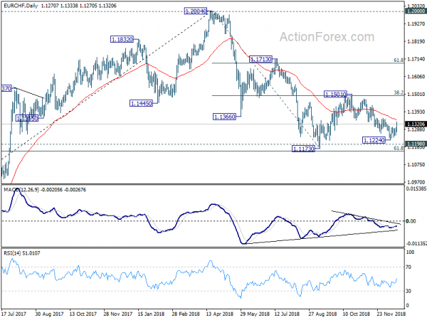 EUR/CHF rises to as high as 1.1333 so far today as rebound from 1.1224 accelerates. Intraday bias remains on the upside for 1.1356 resistance first. Decisive break there should confirm near term reversal. In that case, further rally should be seen back to 1.1501 resistance. On the downside, below 1.1288 will turn bias neutral first. But retreat should be combined well above 1.1224 low to bring another rally.