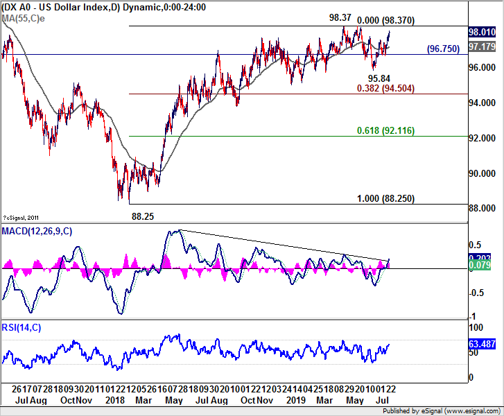 Dollar index’s rebound from 95.84 extended higher to close at 98.01 last week. For now, we’re still seeing the index as in consolidation from 98.37 high. Thus, in next rise, we don’t envisage a firm break of 98.37 yet. That corresponds to 1.1107 low in EUR/USD. Break of 96.75 support will bring another falling leg inside the consolidation pattern and target 95.84 and below. However, sustained break of 98.37, together with firm break of 1.1107 in EUR/USD, will confirm up trend resumption.