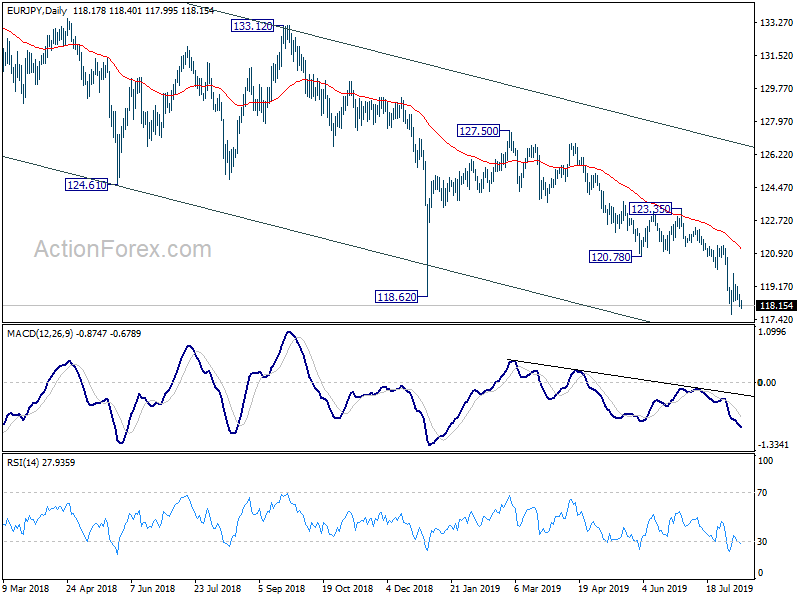 EUR/JPY drops mildly today but stays above 117.67 temporary low. Intraday bias remains neutral for the moment and more consolidations could be seen. But even in case of another recovery, upside should be limited below 120.05 support turned resistance to bring fall resumption. On the downside, break of 117.67 will resume recent fall from 127.50 to 114.84 support next.