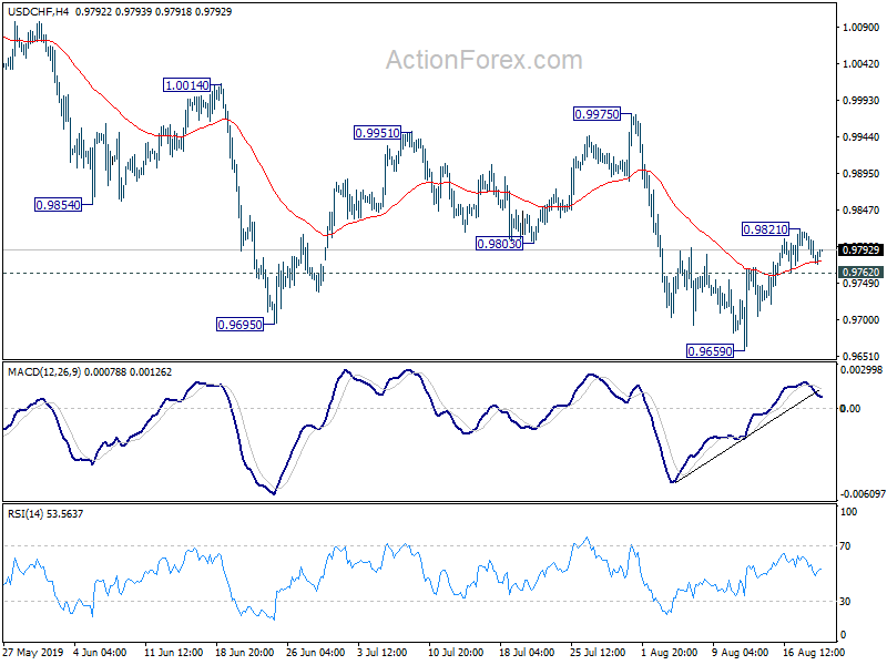A temporary topis formed at 0.9821 in USD/CHF and intraday bias is turned neutral first. On the downside, break of 0.9762 will suggest completion of recovery from 0.9659. Intraday bias will be turned back to the downside for retesting 0.9659 first. On the upside, above 0.9821 will extend the rebound to 55 day EMA (now at 0.9856). Sustained break will target 0.9975 resistance.