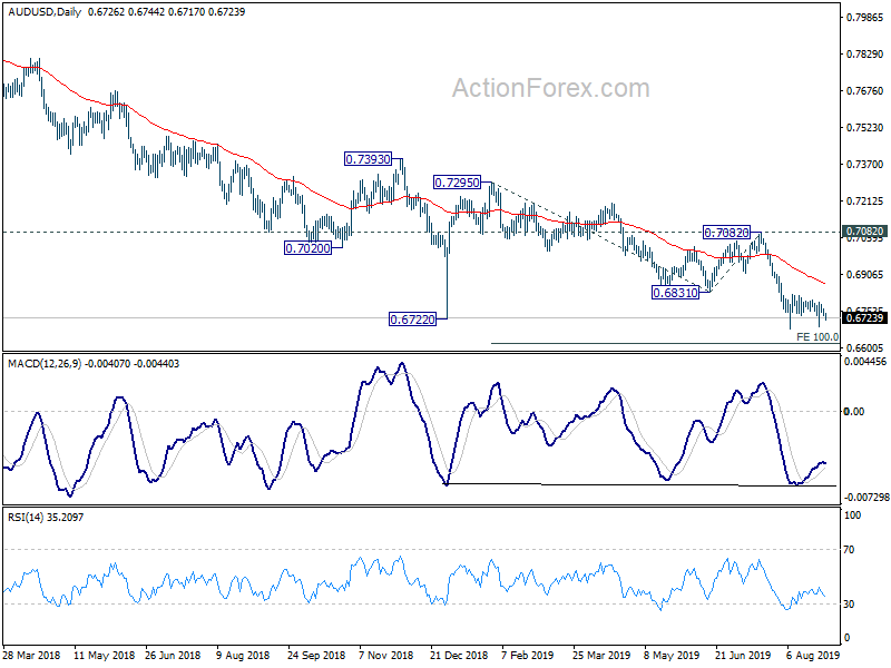 In the bigger picture, decline from 0.8135 (2018 high) is seen as resuming the long term down trend from 1.1079 (2011 high). Firm break of 0.6826 (2016 low) should confirm this bearish view. Further fall should be seen to 0.6008 (2008 low) next. On the upside, break of 0.7082 resistance is needed to be the first sign of medium term bottoming. Otherwise, outlook will remain bearish even in case of strong rebound.