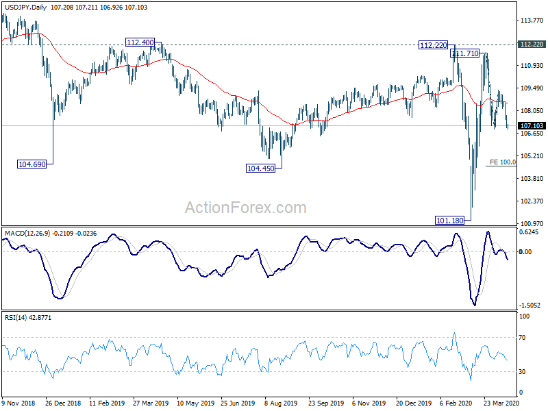 Focus is now on 106.91 support in USD/JPY. Firm break there will resume whole decline from 111.71. Intraday bias will be turned to the downside for 100% projection of 111.71 to 106.91 from 109.38 at 104.58. On the upside, break of 109.38 will suggest that fall from 111.71 has completed. Intraday bias will be turned back to the upside for 111.71/112.22 resistance zone.