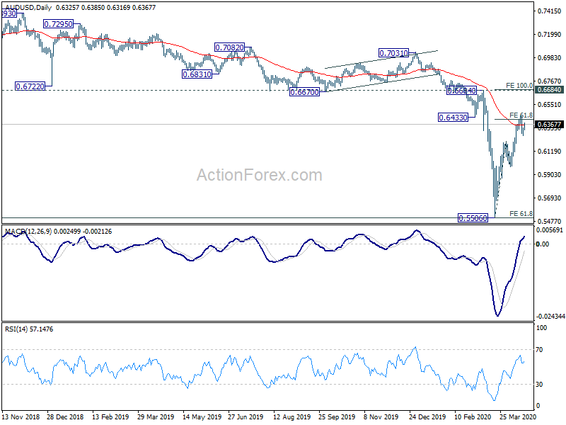 AUD/USD recovered after hitting 4 hour 55 EMA but stays below 0.6444 temporary top. Intraday bias remains neutral first. on the upside, break of 0.6444 will extend the rebound from 0.5506 to 100% projection of 0.5506 to 0.6213 from 0.5979 at 0.6686, which is close to 0.6684 key resistance. On the downside, break of 0.6213 resistance turned support will argue that such rebound has completed. Intraday bias will be turned back to the downside for 0.5979 support for confirmation.
