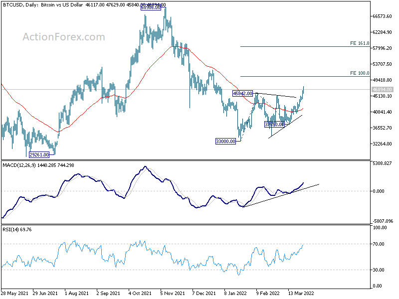 Bitcoin surged over the weekend and broke through 45842 near term resistance. The development confirms resumption of whole rebound from 33000. Near term outlook will stay bullish as long as 44432 support holds. Next target is 100% projection of 33000 to 45842 from 37550 at 50392.