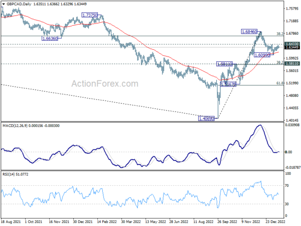 Technically, GBP/CAD would be an interesting one to watch today. Pull back from 1.6846 short term top is contained by 55 day EMA so far. Break above 1.6433 minor resistance will argue that such correction has completed, and bring stronger rise to retest 1.6846 high. On the other hand, break of 1.6099 will extend the fall from 1.6846 to 1.5811 cluster support (38.2% retracement of 1.4069 to 1.6846), even as a corrective move.