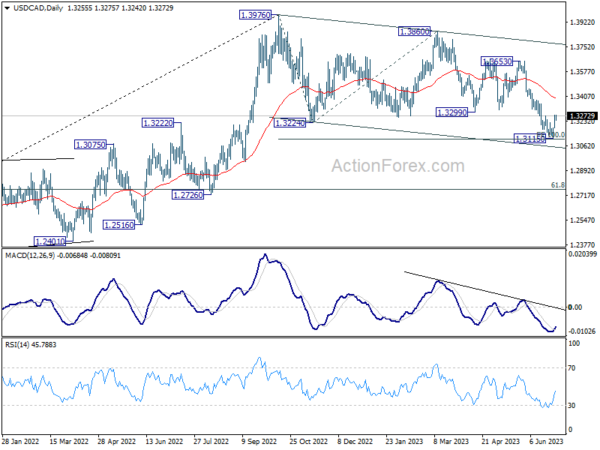 USD/CAD’s break of 1.3224 minor resistance should confirm short term bottoming at 1.3115, on bullish convergence condition in 4H MACD. Intraday bias is back on the upside for 1.3229 support turned resistance. Firm break there will extend the rebound to 55 D EMA (now at 1.3389). On the downside, break of 1.3115 is needed to confirm resumption of recent decline. Otherwise, more consolidative trading should be seen first, in case of retreat.
