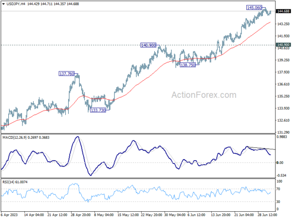Intraday bias in USD/JPY remains neutral for consolidations below 145.06. Break of 55 4H EMA (now at 143.40) could trigger deeper correction. But further rally will remain in favor as long as 140.90 resistance turned support holds. On the upside, break of 145.06 will resume larger rise to 161.8% projection of 127.20 to 137.90 from 129.62 at 146.93.