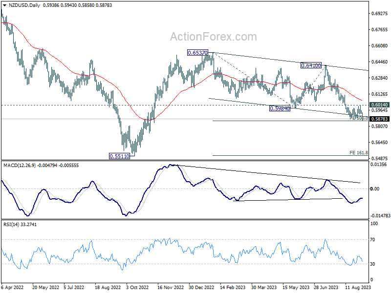 Technically, NZD/USD resumes the fall from 0.6410 today by breaking through 0.5885 support. Immediate attention is now on 100% projection of 0.6537 to 0.5984 from 0.6410 at 0.5857. Decisive break there, together with sustained trading below medium term channel support, could prompt downside acceleration to 161.8% projection at 0.5515, which is close to 0.5511 (2022) low). Even in the event of a strong recovery, the pair’s outlook remains bearish as long as 0.6014 resistance holds.