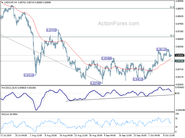 Intraday bias in USD/CHF is turned neutral first with current retreat. On the upside, above 0.8611 will resume the rebound from 0.8374 to 38.2% retracement of 0.9223 to 0.8374 at 0.8698. Sustained break there will argue that fall from 0.9223 has completed after defending 0.8332 low. However, firm break of 0.8529 minor support will turn bias back to the downside for retesting 0.8374/8401 support zone instead.