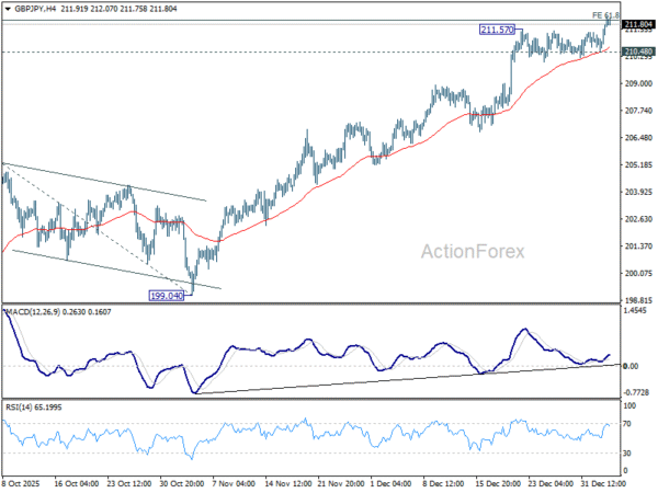 GBP/JPY’s rally resumed by breaking through 211.57 temporary top and intraday bias is back on the upside. Decisive break of 61.8% projection of 184.35 to 205.30 from 199.04 at 211.98 will extend current up trend to 100% projection at 219.99 next. On the downside, break of 210.48 support will argue that a short term top is already formed, and turn bias back to the downside for deeper pullback.