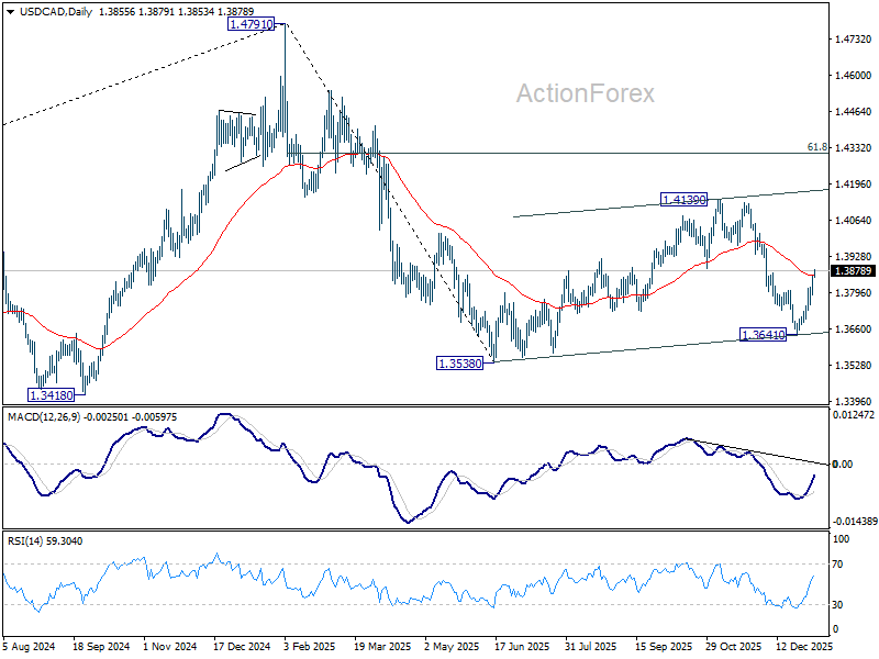 USD/CAD’s rally from 1.3641 continues today and intraday bias stays on the upside. Current strong momentum suggests that corrective pattern from 1.3538 is still extending, in its third leg. Sustained trading above 55 D EMA (now at 1.3859) will pave the way to 1.4139 resistance next. On the downside, below 1.3789 minor support will turn intraday bias neutral first.
