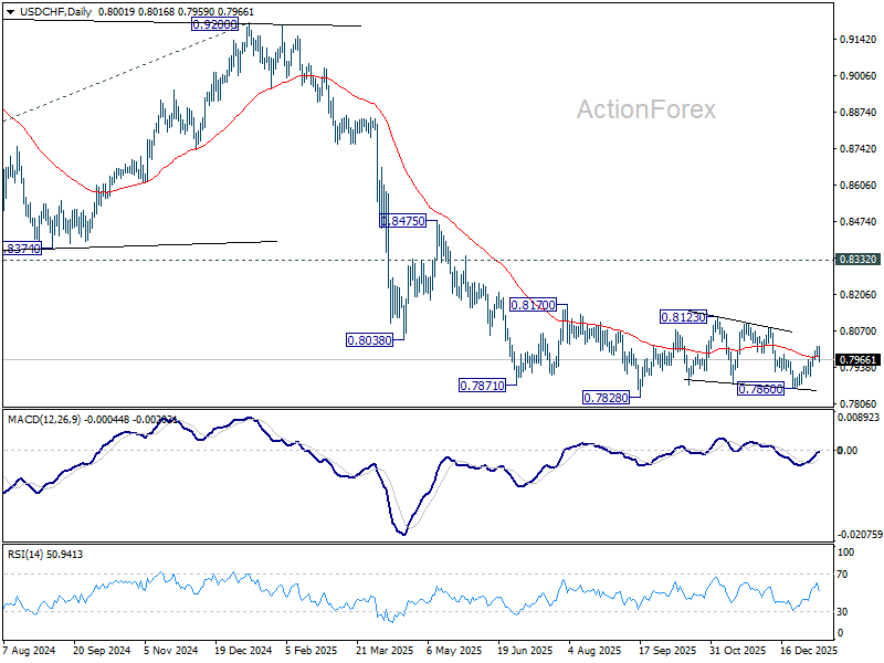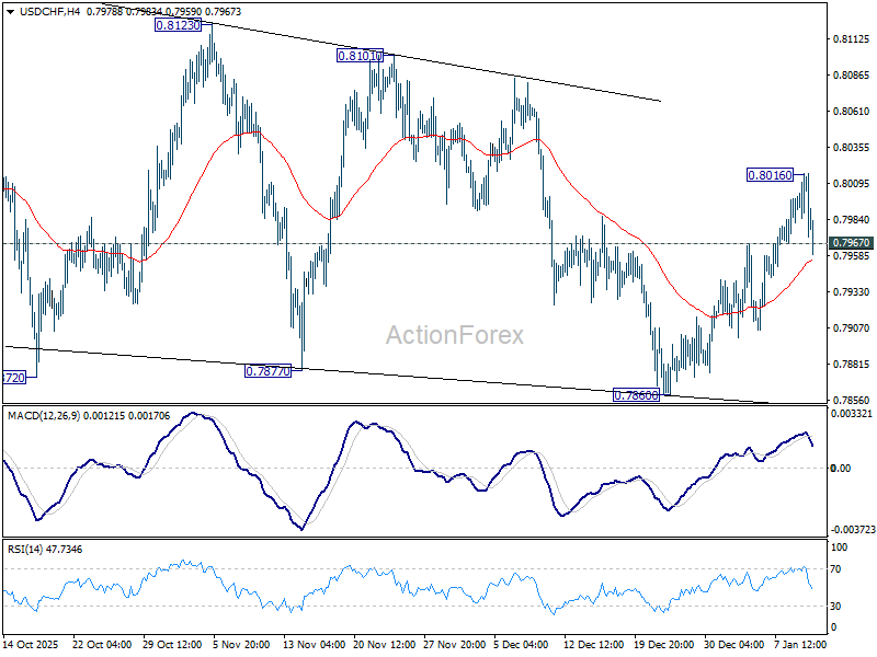 Intraday bias in USD/CHF is turned neutral with today’s retreat and break of 0.7967 minor support. Overall outlook is unchanged that corrective pattern from 0.7828 low is extending. On the upside, above 0.8016 will target 08123 resistance next. Nevertheless, break of 0.7860 will bring retest of 0.7828, with odds of a break there to resume the larger down trend.