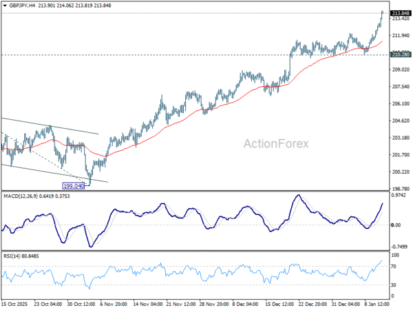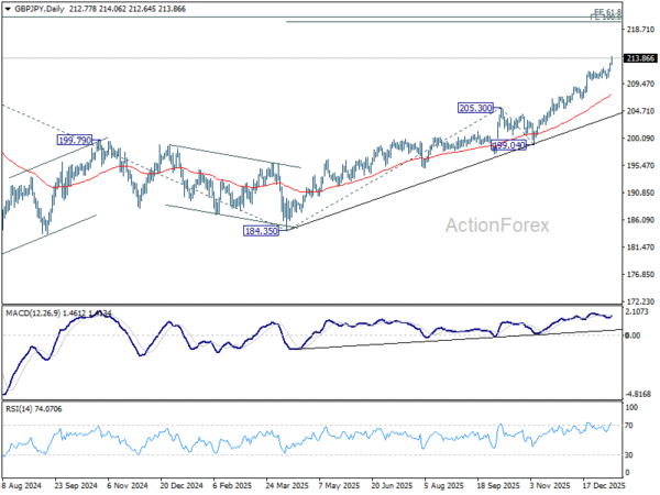 GBP/JPY’s rally accelerates higher today and intraday bias on the upside. Current up trend should now target 100% projection of 184.35 to 205.30 from 199.04 at 219.99 next. For now, outlook will stay bullish as long as 210.28 support holds, in case of retreat.