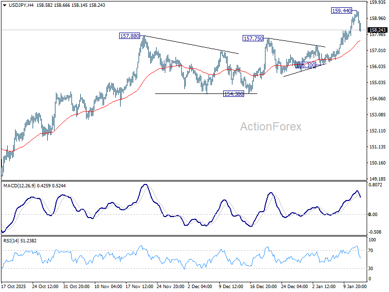 Intraday bias in USD/JPY remains neutral at this point. Retreat from 159.44 temporary top could extend lower. But downside should be contained above 156.10 support to bring another rally. On the upside, above 159.44 will resume larger rise from 139.87. Next target is 200% projection of 142.66 to 150.90 from 145.47 at 161.95, which is close to 161.94 high.