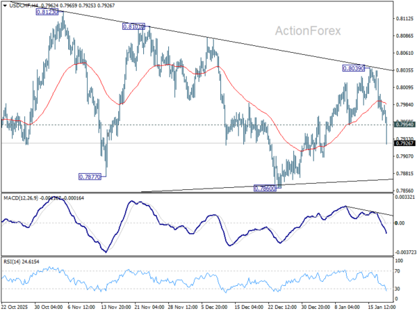 USD/CHF’s fall from 0.8039 accelerates lower today and the break of 0.7954 support confirms that rebound from 0.7860 has completed. Intraday bias is back on the downside for 0.7860 support. Firm break there will argue that larger down trend is ready to resume through 0.7828 low. For now, risk will stay on the downside as long as 55 4H EMA (now at 0.7984) holds, in case of recovery.