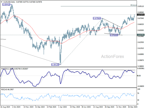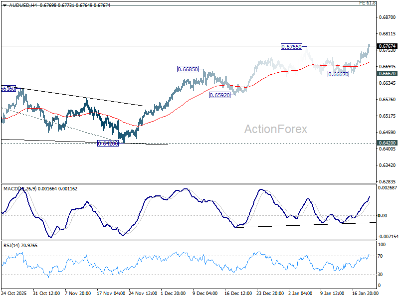 AUD/USD’s rally from 0.5913 resumed by breaking through 0.6765 resistance today. Intraday bias is back on the upside. Further rise should be seen to 61.8% projection of 0.5913 to 0.6706 from 0.6420 at 0.6910 next. For now, near term outlook will stay bullish as long as 0.6667 support holds, in case of retreat.