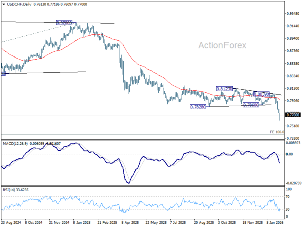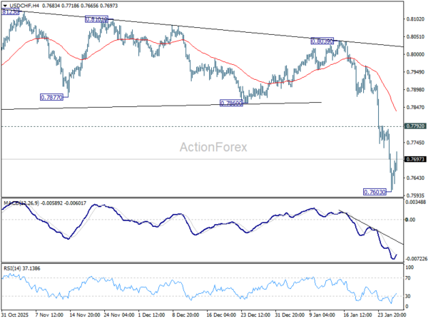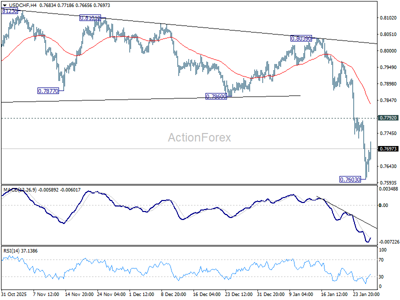 A temporary low is formed at 0.7603 in USD/CHF with current recovery and intraday bias is turned neutral first. Outlook will stay bearish as long as 0.7792 resistance holds Break of 0.7603 will resume the larger down trend to 0.7382 projection level next. However, firm break of 0.7792 will turn bias back to the upside, for stronger rebound to 0.7860 support turned resistance.
