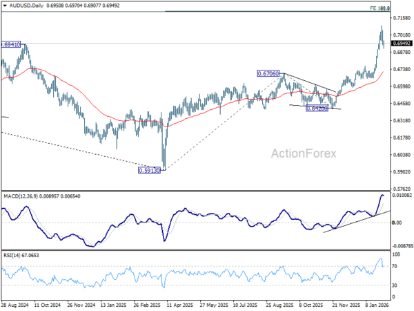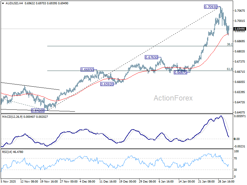 Intraday bias in AUD/USD remains neutral as consolidations continue. Risk will stay on the upside as long as 55 4H EMA (now at 0.6916) holds. Above 0.7093 will extend larger up trend to 100% projection of 0.5913 to 0.6706 from 0.6420 at 0.7213 next. Nevertheless, sustained break of 55 4H EMA will confirm short term topping, and bring lengthier consolidations before rally resumption. Deeper pullback would then be seen to 38.2% retracement of 0.6420 to 0.7093 at 0.6836.