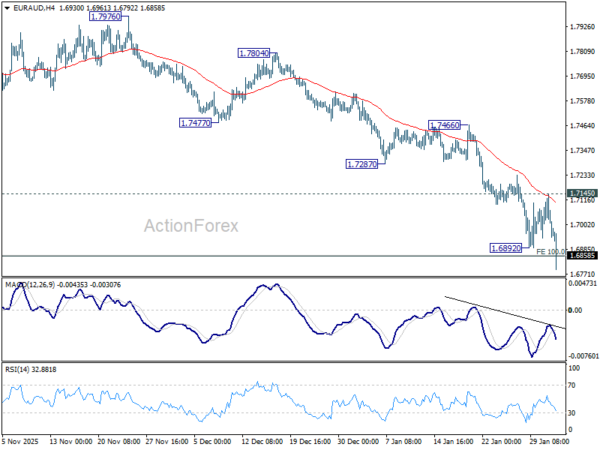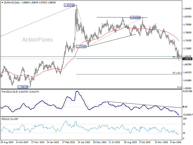 EUR/AUD’s decline resumed by breaking through 1.6892 temporary low and intraday bias is back on the downside. Sustained trading below 100% projection of 1.8554 to 1.7245 from 1.8160 at 1.6851 will pave the way to 138.2% projection at 1.6351 next. On the upside, break of 1.7145 resistance is needed to indicate short term bottoming. Otherwise, will remain bearish in case of recovery.