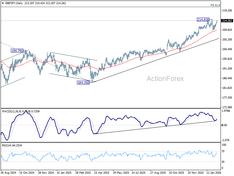 Immediate focus is back on 214.83 as GBP/JPY’s rebound accelerates higher. Firm break there will resume larger up trend to 220.90 projection level next. Rejection by 214.83 will bring more consolidations first. But in case of another dip, downside should be contained by 55 D EMA (now at 209.70) to bring rally resumption.