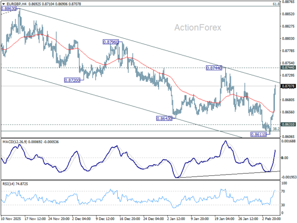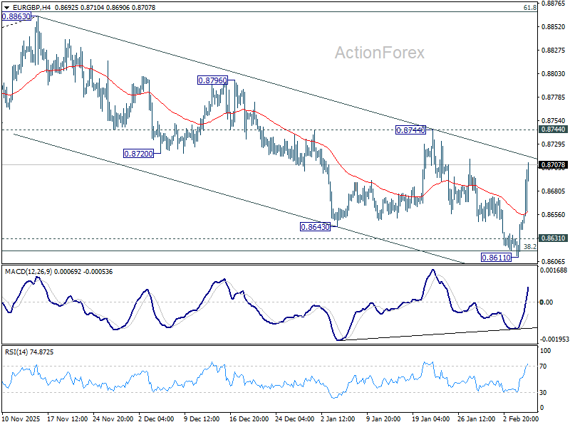 EUR/GBP’s rebound from 0.8611 extended higher today but stays below 0.8744 resistance. Intraday bias stays neutral first. On the upside, firm break of 0.8744 will argue that fall from 0.8863 has completed as a correction. Intraday bias will be back to the upside for retesting 0.8863, with prospect of resuming larger up trend. Nevertheless, on the downside, decisive break of 0.8631 cluster support (38.2% retracement of 0.8221 to 0.8663 at 0.8618) will carry larger bearish implications.